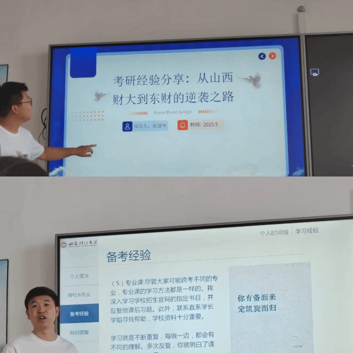 旅游管理专业张新成老师精心组织策划了小学期专题活动——优秀学长学姐的经验分享会。活动特邀4位在2025年毕业季中成功考取公务员、考研上岸(含跨专业考研)以及考入211名校的旅游管理专业优秀毕业生代表“回家”,为学弟学妹们倾囊相授备考心得、学习方法和成长感悟。分享会现场气氛热烈,互动频繁,干货满满。