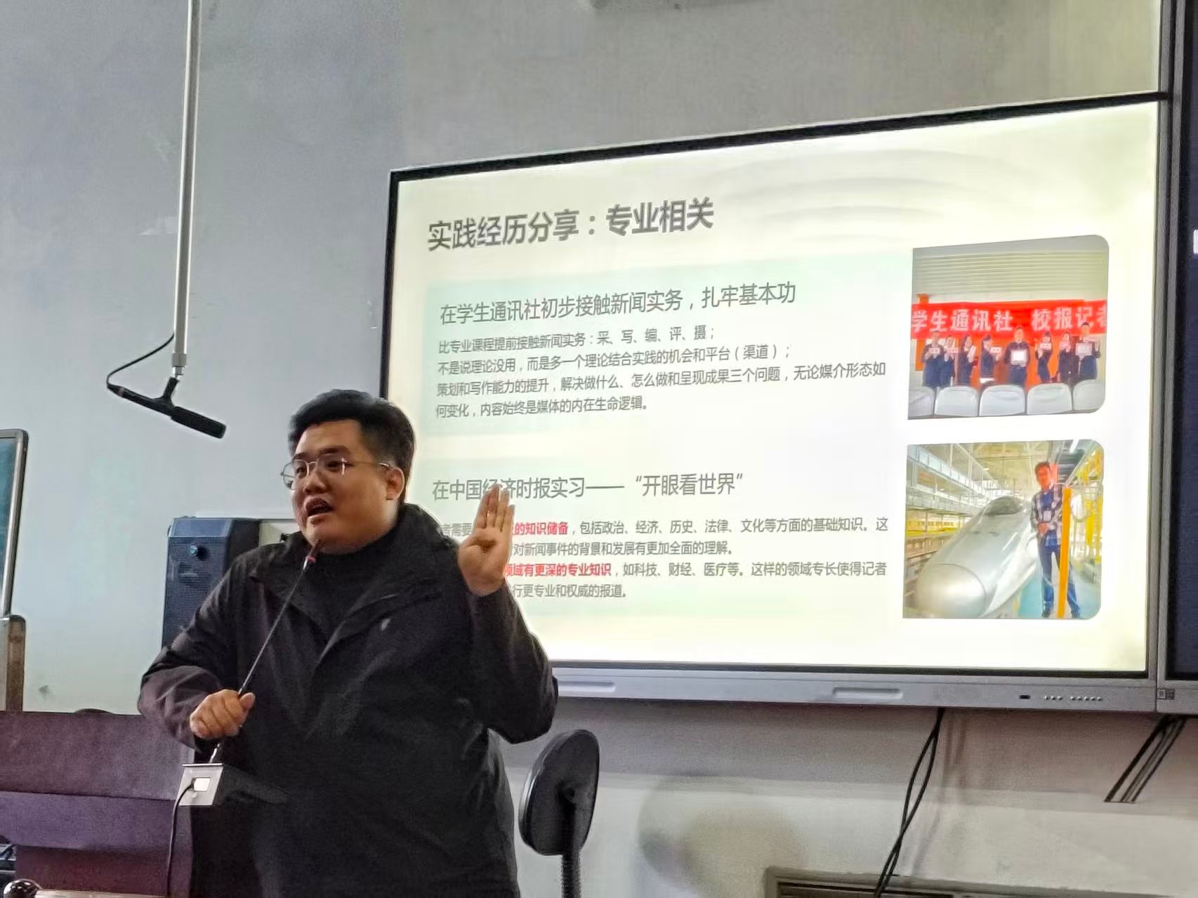 新生作报告。胡祺以“实践·洞察·成长”为核心主题,为新闻专业和网络新媒体专业新生送上了一堂兼具实践指导与职业启迪的成长课。