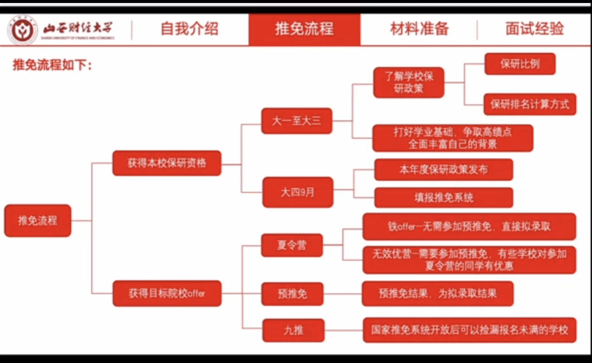 孙上学长的分享以清晰的时间线为脉络,系统梳理了从1月到10月的保研完整流程,围绕保研全年时间轴展开分享,内容涵盖保研完整流程划分、本校推免评定规则、材料准备清单与格式要求、夏令营全流程攻略、面试技巧与高频问题应答策略,以及预推免和九推的系统操作与志愿填报方法。他从本校推免评定的规则讲起,详细分析了学业成绩、科研经历、学科竞赛等保研加分项的权重,提醒同学们要尽早明确目标院校政策,做好成绩与背景提升。针对预推免与九推,他也讲解了推免系统的操作流程与志愿填报策略,最后特别强调了心态调整的重要性,鼓励同学们用积极的状态应对保研全程的压力与不确定性。